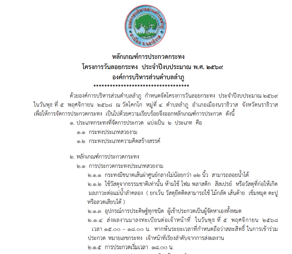 หลักเกณฑ์กาประกวดกระทง โครงการวันลอยกระทง ประจำปีงบประมาณ พ.ศ.ศ. ๒๕๖๙ เขียนโดย ไฟซอล มะมิงซี หมวด: ข่าวเผยแพร่