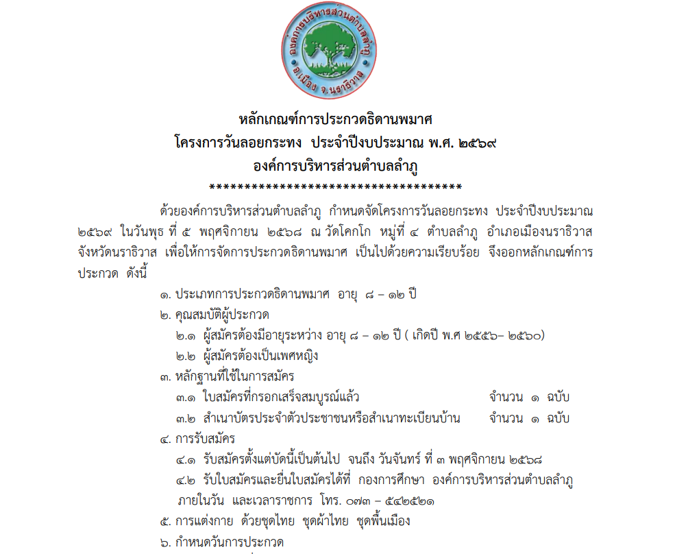 หลักเกณฑ์การประกวดธิดานพมาศ โครงการวันลอยกระทง ประจำปีงบประมาณ พ.ศ. ๒๕๖๙ เขียนโดย ไฟซอล มะมิงซี หมวด: ข่าวเผยแพร่