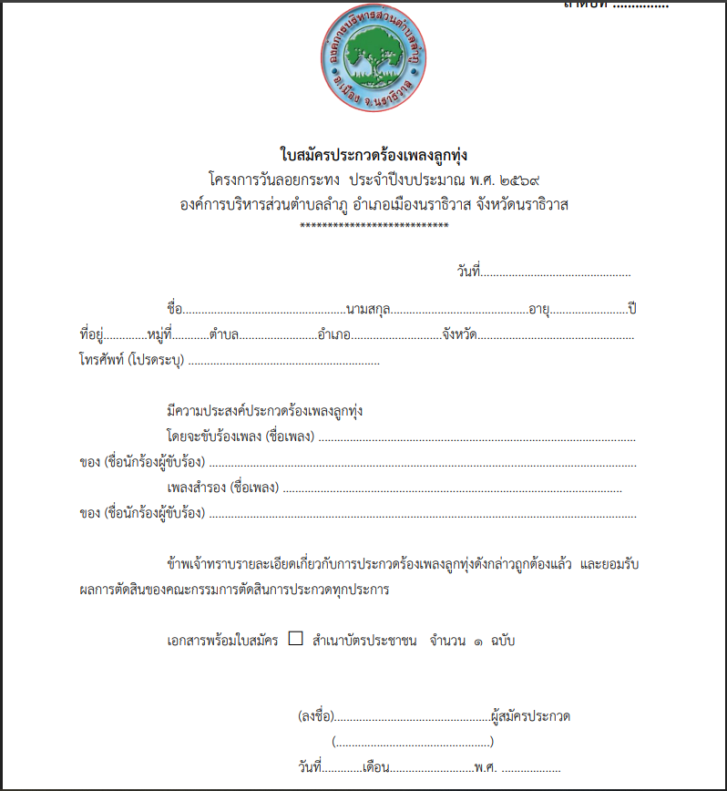 ใบสมัครประกวดร้องเพลงลูกทุ่ง โครงการวันลอยกระทง ประจำปีงบประมาณ พ.พ.ศ. ๒๕๖๙ เขียนโดย ไฟซอล มะมิงซี หมวด: ข่าวเผยแพร่