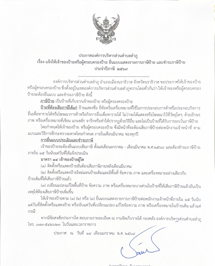 แจ้งให้เจ้าของป้ายหรือผู้ครอบครองป้าย ยื่นแบบแสดงรายการภาษีป้าย และชำระภาษีป้าย ประจำปีภาษี ๒๕๖๙ เขียนโดย ไฟซอล มะมิงซี หมวด: ข่าวเผยแพร่